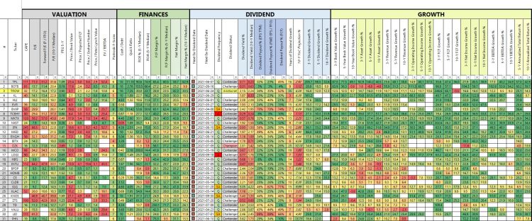 W zakładce Dividend oraz Non-Dividend zobaczyć możemy ogromne tabelki wypełnione danymi. W zasadzie podzielić je można na dwie części – główna, której używa się do filtrowania parametrów i ustawiania swoich własnych preferencji oraz druga, która zawierając więcej wskaźników finansowych, może służyć do dogłębniejszej analizy fundamentalnej.