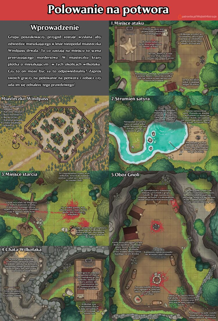 Oprócz zwykłych map przedstawiających lokacje do wykorzystania w waszych własnych scenariuszach, tworzę także gotowe scenariusze mieszczące się na jednej stronie! Pozwolą one wam szybko i sprawnie przygotować całą sesję do waszego ulubionego systemu. Tak jak w przypadku pojedyńczych map ich wersje w lepszej jakości oraz poszczególne zawarte w nich mapy dostępne są dla moich patronów.