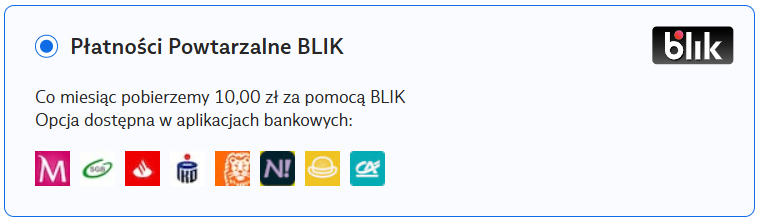Ważne! Ta metoda płatności jest obsługiwana przez wybrane banki (lista aplikacji bankowych, wspierających Płatności powtarzalne BLIK widoczna jest w procesie płatności).