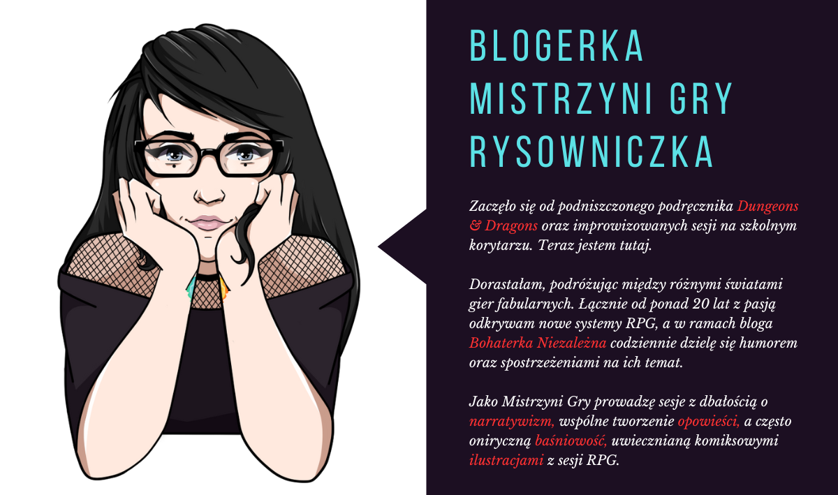 W czerwcu 2022 roku założyłam bloga o nazwie Bohaterka Niezależna. Postanowiłam wówczas dzielić się z fandomem erpegowym codzienną dawką memów, śmieszków oraz pogodnych treści, co spotkało się z niezwykle ciepłym odbiorem.