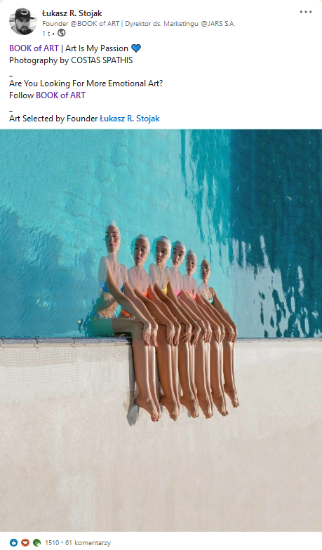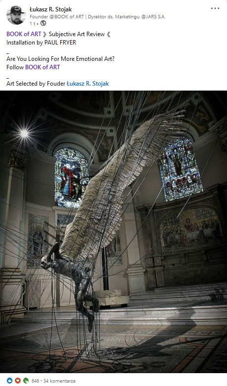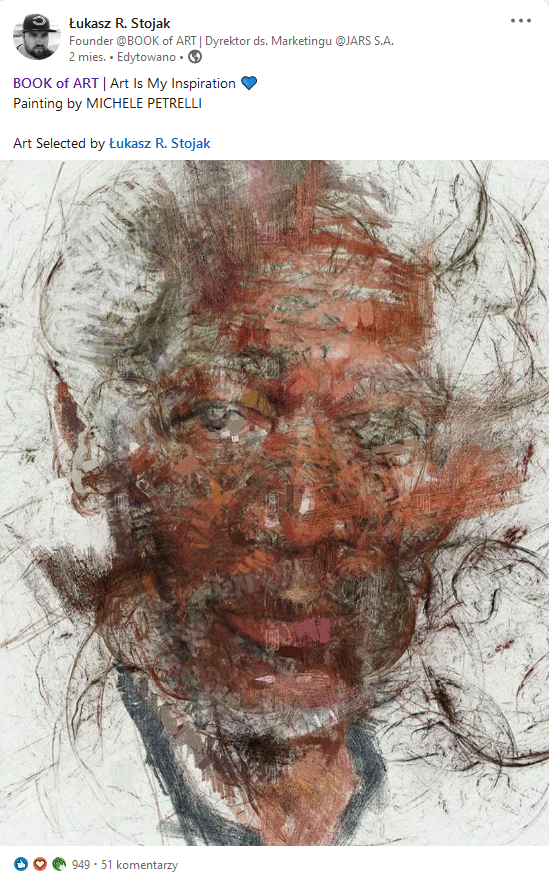 My name is Łukasz R. Stojak and after many years of passion for the art of contemporary artists and the use of new technologies on the art market, I decided to share my passion. I took up a new challenge which is the promotion of the art world in the virtual world. I am the founder of the BOOK of ART. Probably the best project for the promotion of contemporary art in the virtual world. I run a "Subjective Review of Contemporary Art".