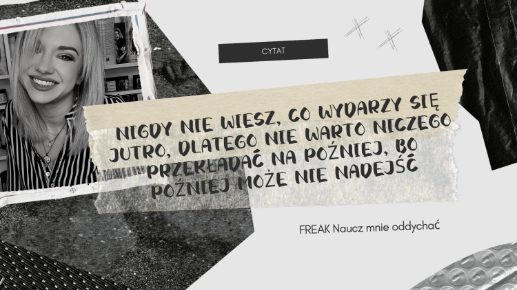Kolejną częścią serii jest FREAK Naucz mnie oddychać. Jeśli lubicie motyw Pięknej i Bestii to idealna książka dla Was. Opowiada przełamywaniu lodów, walce z demonami i wierze w siebie. Pokazuje pozoli rozwijającą się relację dwójki pokrzywdzonych przez los ludzi.