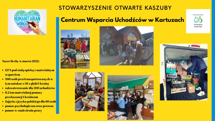 Tego popołudnia na Rynku w Kartuzach można było posłuchać i potańczyć do utworów wykonanych przez artystów sceny ukraińskiej oraz porozmawiać o obecnej działalności Stowarzyszenie Otwarte Kaszuby , o trwających projektach oraz o udzielaniu pomocy i wsparciu dalszych działań Centrum Wsparcia Uchodźców w Kartuzach oraz Centrum Wsparcia Uchodźców w Gdańsku.
