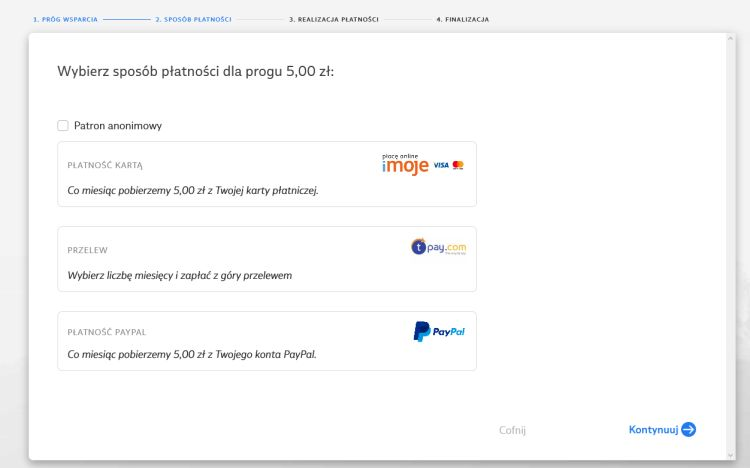 Włączenie kilku metod płatność zwiększa szansę na pozyskanie Patronów. Każdy z potencjalnych wspierających ma inne preferencje - jeden woli płatności BLIKiem, drugi kartą, jeszcze inny PayPalem - warto więc pozostawić szerszy wachlarz możliwości do wyboru!
