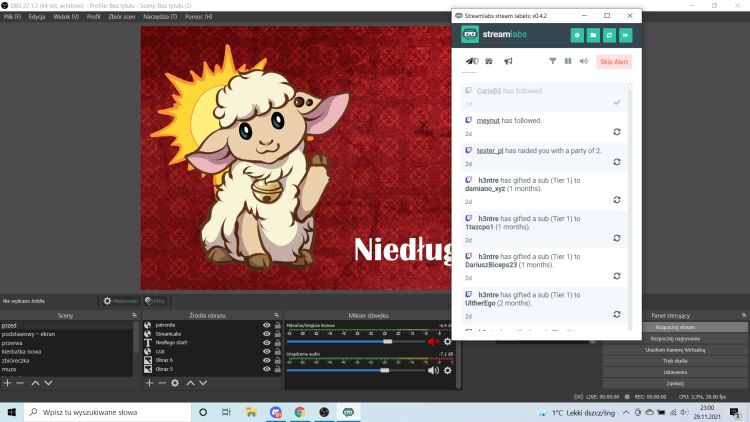 Przed streamem potrzebuję uruchomić na głównym laptopie trzy programy. Pierwszy to oczywiście gra; drugi to OBS Studio służący do streamowania wcześniej przygotowanych scen; trzeci to Stream Labels, który odpowiada za aktualizacje górnego paska interfejsu (pobiera z dysku na bieżąco update'owane informacje o ostatnich subskrybentach czy followach, a także pozwala na wyświetlanie napisów końcowych). Gdy tylko włączę OBS-a i Stream Labels, aktywuję w tym drugim jeden z ostatnich alertów, by upewnić się, że działają poprawnie (rzadko, ale zdarza się, że Streamlabs zarządzające moimi powiadomieniami ma czkawkę – na szczęście wystarczy restart). Zawsze upewniam się także, że mam wyłączoną przeglądarkę, Discorda i inne większe programy, które mogłyby niepotrzebnie zaśmiecać pamięć, a co gorsza, wysyłać mi powiadomienia o wiadomościach.