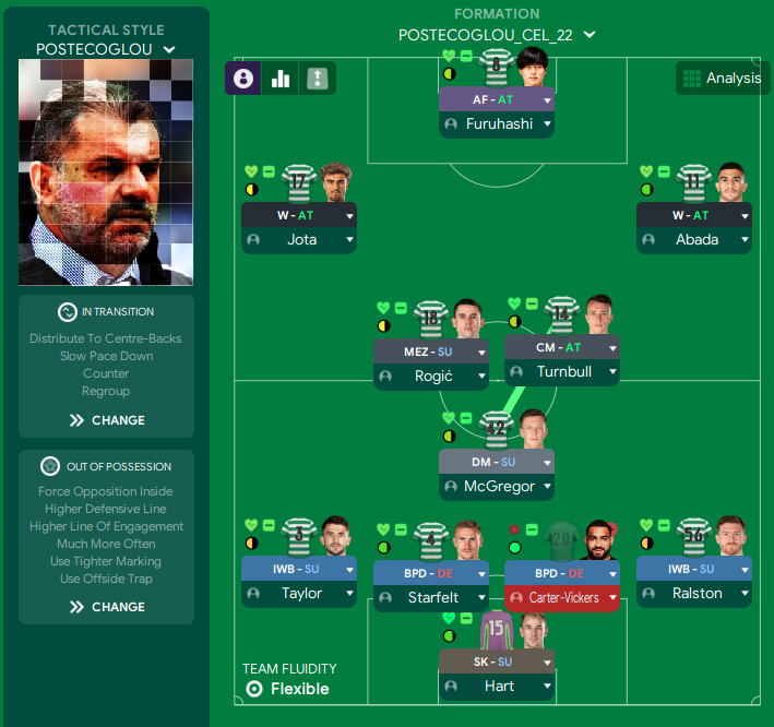 Postecoglou ustawia Celtic zawsze w formacji z czwórką obrońców, lecz zamiast nakazać wahadłowym, aby wychodzili wysoko i zapewniali szerokość, wymaga od nich częstego schodzenia z piłką do środka i wspomagania pomocników. Choć na podstawie swoich statystyk wydaje się, że Celtic gra w ustawieniu 1-4-2-3-1 lub co najwyżej 1-4-3-3, to podczas budowania akcji przeważnie grają tylko z jednym środkowym pomocnikiem w roli pivota (McGregor). To pozycja kluczowa w Celticu Postecoglou zarówno w fazie posiadania piłki, gdy wspiera ofensywę i gra między liniami, ale także po jej stracie, gdy powierza mu się zadania aktywnego odbioru piłki.