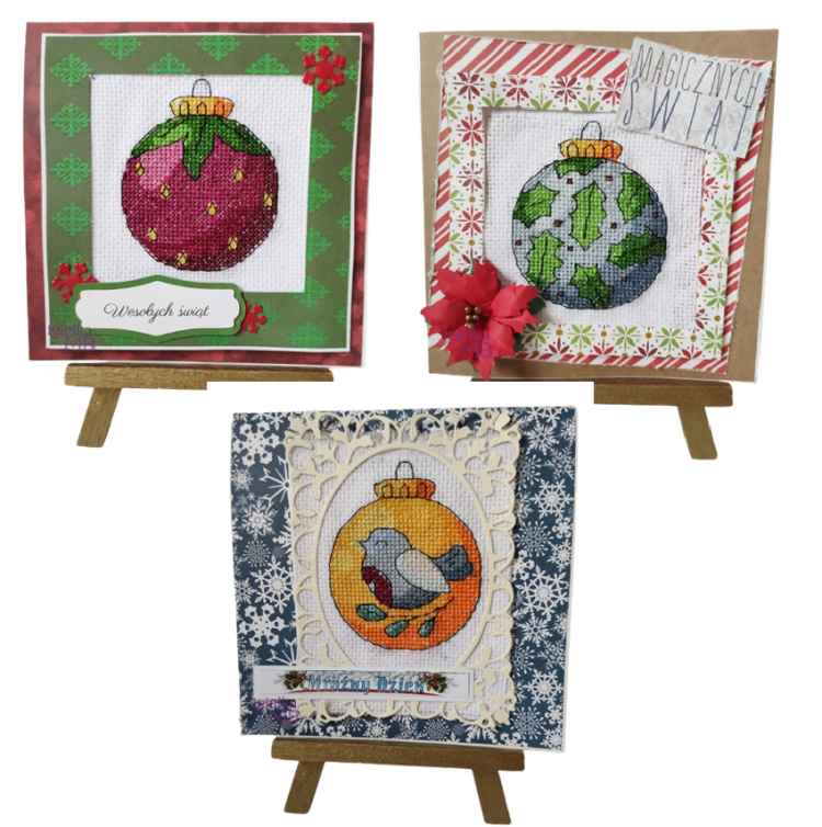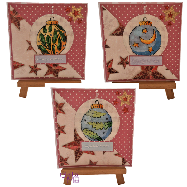 W temacie wzorów ostatnio za sprawą Kasi (pogoniła mnie kobieta do pracy ^_^) przygotowałam kilka wzorów na świąteczne bombki. W sumie wyszło ich 48 bombek, podzielonych na 14 wzorów. Całość (jako jeden plik) dostępna TU. Cześć wzorów trafiło do testerek, a te jak zawsze dały z siebie to co najlepsze i pięknie zaprezentowały wzory w formie świątecznych zawieszek i kartek.