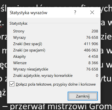 "Stara kobieta i smok" ma w tej chwili ponad 486 tysięcy znaków ze spacjami i komputerowych 208 stron. Czy to dużo? "Orzeł Biały" ma circa milion sto tysięcy znaków, "Orzeł Biały 2" - milion czterysta tysięcy, "Orzeł Biały 3" - milion sto pięćdziesiąt tysięcy. Można więc powiedzieć, że mamy prawie połowę "średniego Orła".