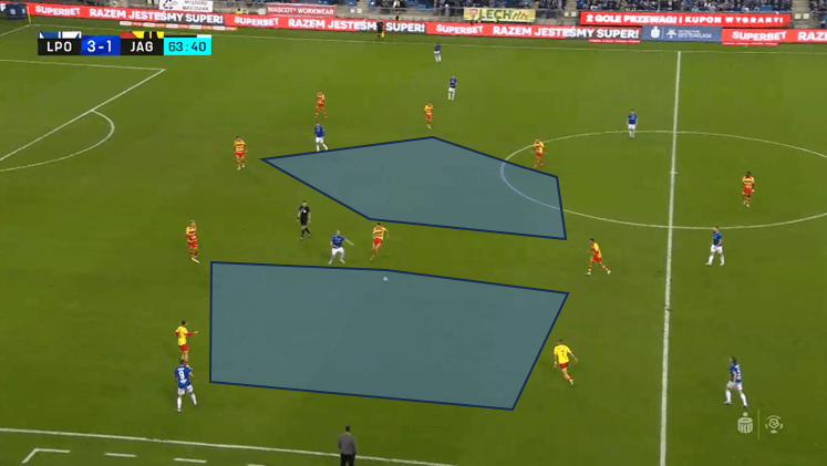 Większość czasu, szczególnie grając przeciwko czołowym drużynom Ekstraklasy, Jagiellonia spędza w tercji środkowej. W rzeczywistości to ich rywale obniżają blok, zostawiając Jagiellonii miejsce na ich połowie i koncentrując się na pressingu dopiero w okolicach połowy boiska. Wówczas podopieczni Siemieńca tworzą pięciokąt z bocznymi obrońcami grającymi wąsko, bardziej niczym odwróceni boczni obrońcy, i tylko jednym pivotem (Romanczuk). Tych pięciu graczy wymienia szybkie podania albo szukając swoich skrzydłowych, którzy trzymają się skrajnie tuż przy linii bocznej, albo grając bardziej pionowo do dwóch środkowych pomocników, którzy operują między liniami i w półprzestrzeniach.