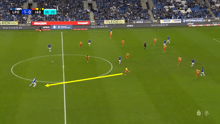 Kluczowym elementem systemu Siemieńca jest jednak rola Romanczuka. Pełni on rolę gracza czyszczącego przedpole, więc ustawia się głębiej niż inni pomocnicy. Jego zadaniem jest wypełnianie dziur podczas skoków pressingowych środkowych pomocników, co odzwierciedla liczba przechwytów, które ten zawodnik zalicza średnio w każdym meczu (6,62). Jest to szczególnie imponujący wynik, jeżeli się pamięta, że Jagiellonia jest jedną z najbardziej dominujących w posiadaniu piłki drużyn w lidze. Gdy cała linia pomocy aktywnie wywiera presję na rywalu, izolowany w środku pola Romanczuk musi nie tylko płynnie reagować na powstające dziury w środku pola, ale i wykonywać szybkie zwroty w tym kierunku w przypadku utraty posiadania.