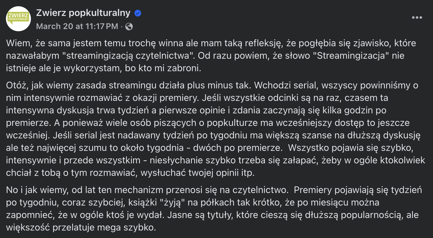 Katarzyna Czajka-Kominiarczuk nie pierwszy raz zmusiła mnie do refleksji, a raczej obudziła uczucie, które gdzieś siedzi we mnie od dłuższego momentu. Na potrzeby narracji utkała teorię "streamingizacji czytelnictwa" czyli potrzeby, a wręcz przymusu mówienia tylko o nowościach i premierach. Do światka literackiego przypełzło to od seriali, a tam pewnie od kina, gdzie główny nacisk narracji kładziono na moment pojawienia się na ekranach. Wiecie, jak napiszę o "Dojrzewaniu" za tydzień to każdy wzruszy ramionami (już jest za późno!). Sally Rooney? Przecież ta jej nowa książka wyszła MIESIĄC temu (a ja nadal nie przeczytałem jej debiutu). Żywotność nowości jest na poziomie żywotności komara, który żyje zazwyczaj maksymalnie kilka tygodni, a po drodze musi jeszcze ugryźć kilkaset osób. Podobnie jest z książką, prawda? Ma ona chwilę, by wedrzeć się do świadomości (ukąsić), by sprawiać wrażenie, że mówią o niej wszyscy, bo już w momencie wydania wisi nad nią widmo trafienia do dyskontu i zniknięcia w otchłani pomiędzy cebulą a papierem toaletowym.