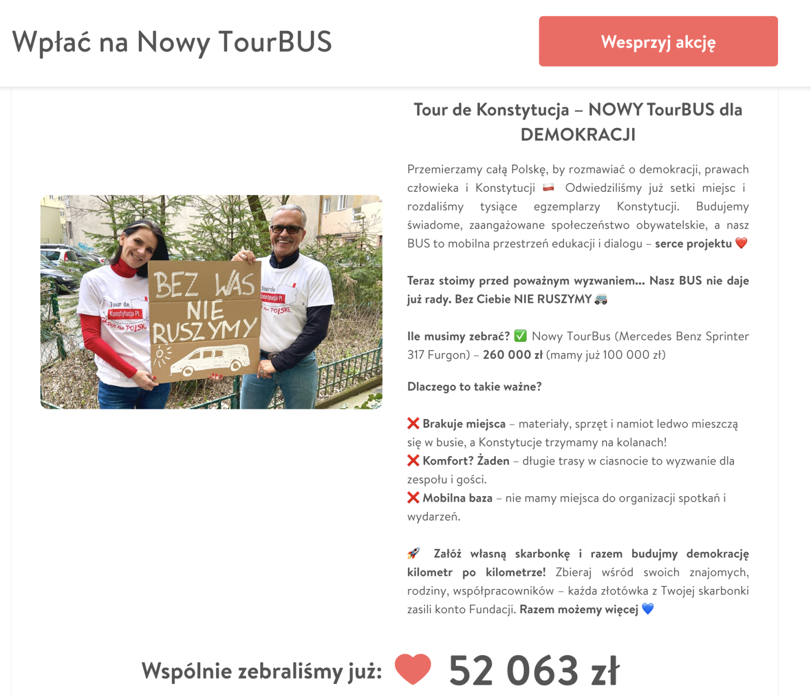 Wspólnie bo do głównej zbiórki powstało kilka skarbonek, które zbierają na jeden cel. To duży sukces, bo TourBus jest niezbędnym narzędziem w naszej misji edukacyjnej - pozwala nam docierać do nawet najmniejszych miejscowości w Polsce z warsztatami i spotkaniami z obywatelami Polski.