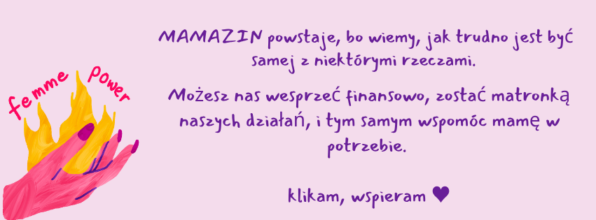 Jestem ciekawa waszego odbioru, dla mnie historia Agaty, którą dzieli się z nami osobiści w 15. numerze Mamazinu, to powiew świeżości i wolności. Zmiana perspektywy. Siła samodzielności, a nie samotność. To też fantastyczny szkic społecznego porządku, w którym wiele z nas, ostatecznie zostaje mamami po rozstaniach. Dużo o tym myślę jako rozstana z ojcem mama córki. Jako córka samotnej matki. Jako wnuczka wdowy. Jako prawnuczka mamy patchworkowej. Dlaczego uwierzyłyśmy, że decyzja o macierzyństwie może być oparta o relację z mężczyzną?