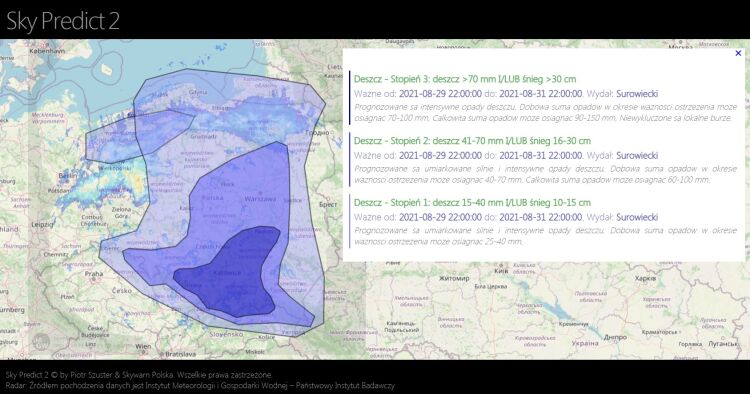 1. Opracowanie nowatorskiego systemu ostrzegania przed groźnymi zjawiskami meteorologicznymi "SkyPredict". Jest on oparty na poligonach, a nie na jednostkach administracyjnych. System ten jest obsługiwany przez całą dobę przez naszych doświadczonych w prognozowaniu pogody Łowców.