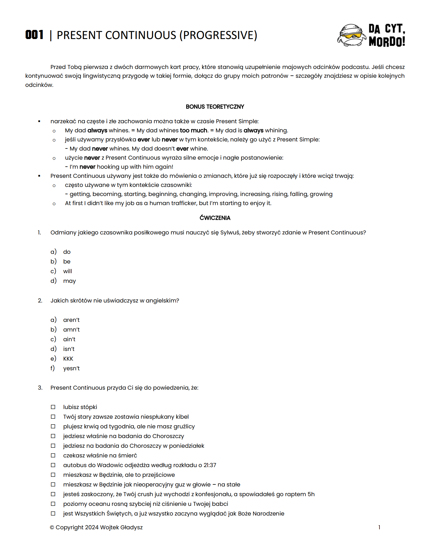 Oprócz zniżek na wszystkie przyszłe produkty sygnowane moim nazwiskiem, dostaniecie kartę pracy do każdego odcinka, która wyglądała będzie podobnie do tych, które możecie znaleźć w opisach pierwszych dwóch odcinków podacstu "da cyt, mordo!":